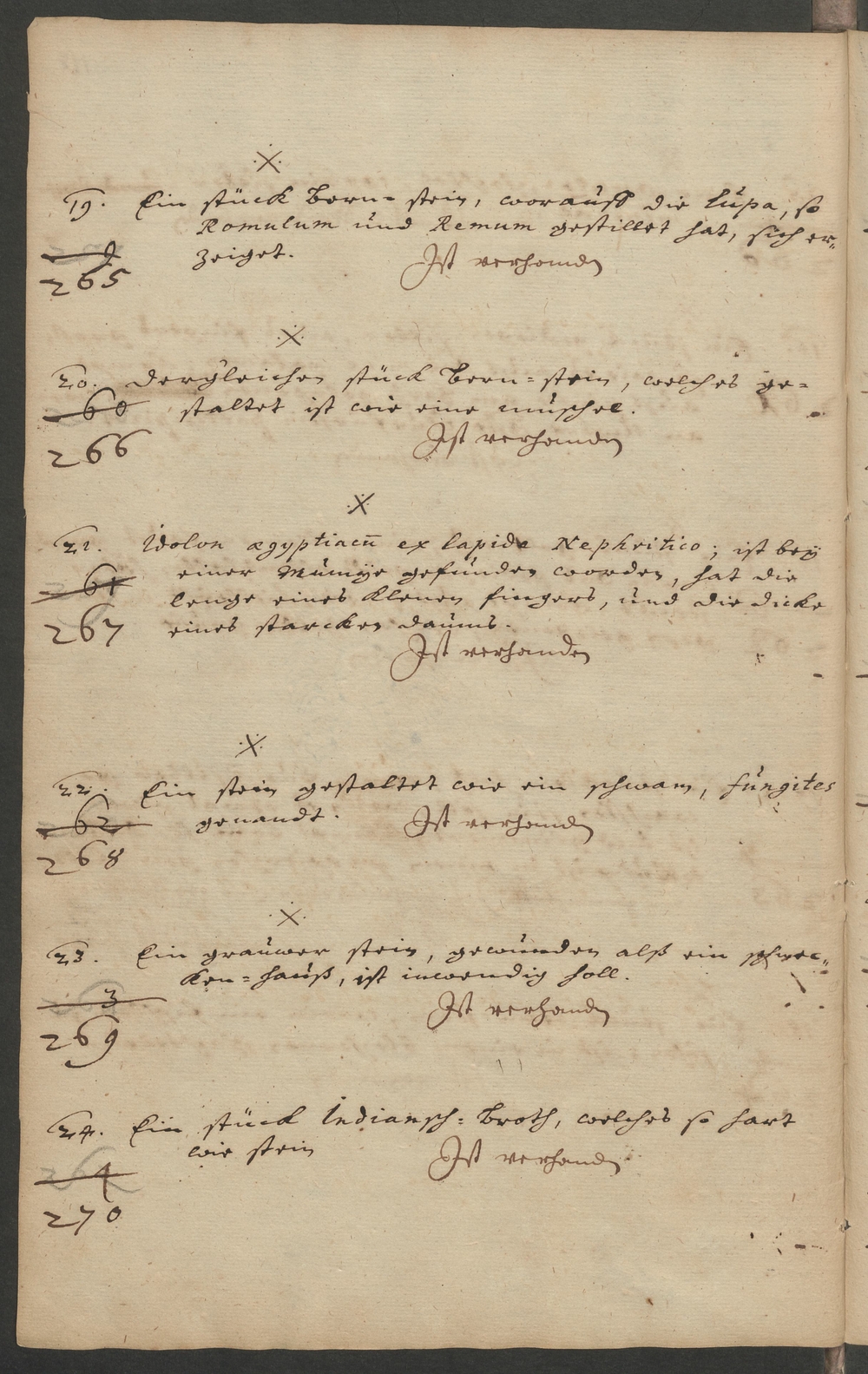X/ 21. 261 267 Idolon aegyptineu ex lapide Nephritico; ist bey/ einer Mumye gefunden worden, hat die/ lenge eines kleinen fingers, und die dicke/ eines starcken daums./ Ist vorhanden./