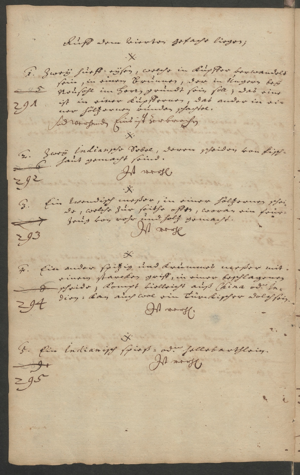 X/ 4. 288 294 Ein ander spitzig und krummes meßer mit/ einem starcken griff, in einer beschlagenen/ scheide, kompt vielleicht auß China od. In-/dien, kann auch wol ein Türkischer Dolch sein./