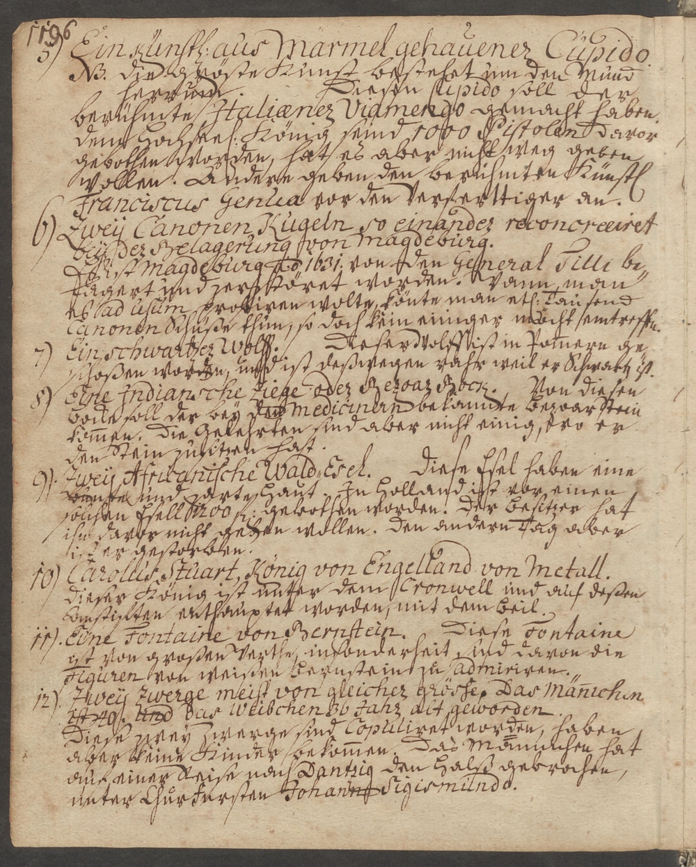 5. Ein künstl. aus Marmel gehauener Cupido./ [Ergänzung:] NB: Die größte Kunst bestehet um den Mund/ herum. Diesen Cupido soll der/ berühmte Italianer Viamengo gemacht haben./ Dem hochseel. König sind 1000 Pistolen davor/ gebothen worden, hat es aber nicht weg geben/ wollen. Andere geben den berühmten Künst./ Franciscus Genua vor den Verfertiger an.