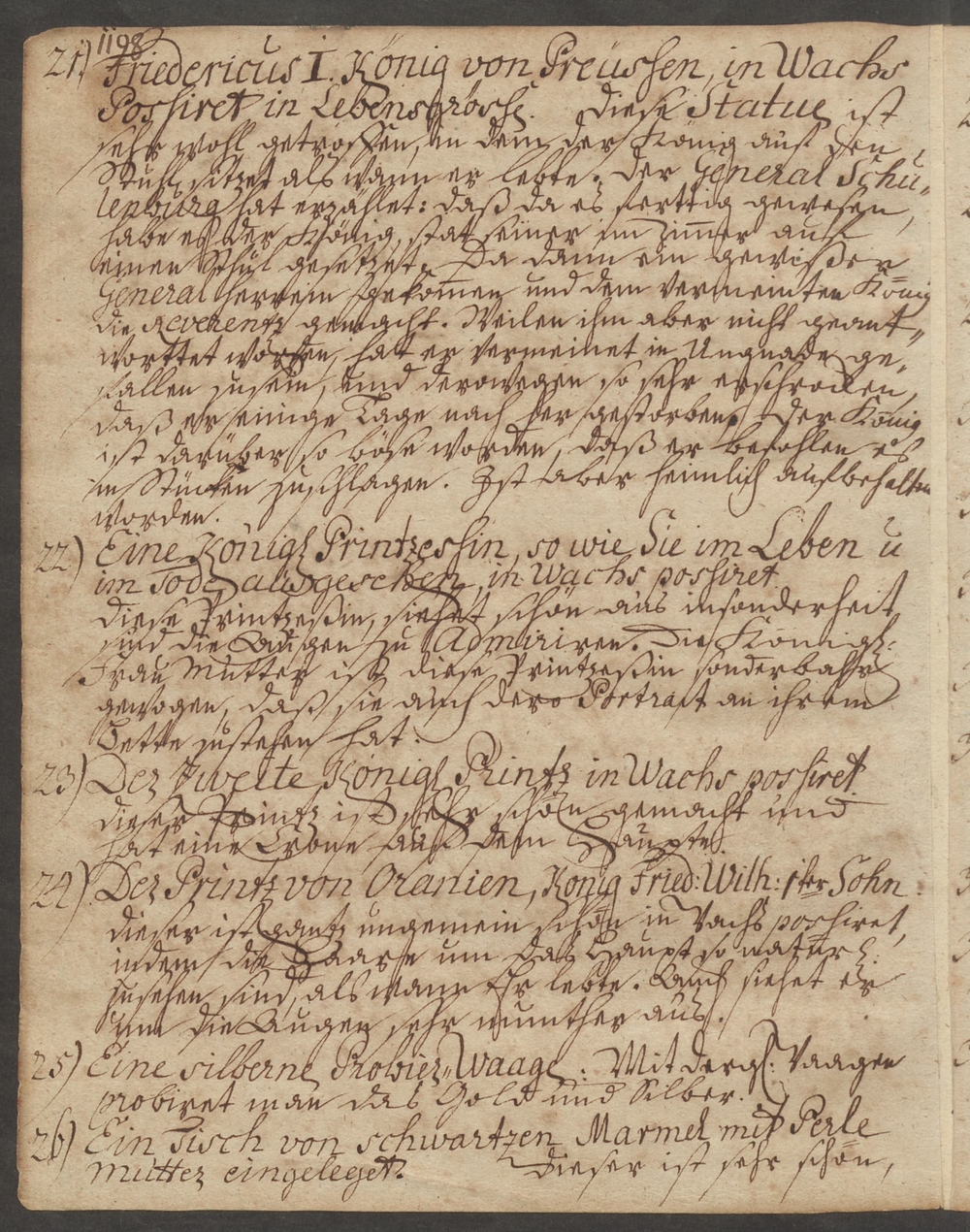 21. Friedericus I. König von Preußen in Wachs/ Possiret in Lebensgröße./ [Ergänzung:] Diese Statue ist/ sehr wohl getroffen, in dem der König auf den/ Stuhl sitzet als wann er lebte. Der General Schu/ lenburg hat erzählet: daß da es ferttig gewesen,/ habe es der König, stat seiner im Zimmer auf/ einen Stuhl gesetzet. Da dann ein gewißer/ General herein gekommen und dem vermeinten König/ die Reverents gemacht. Weilen ihm aber nicht geant/ worttet worden, hat er vermeinet in Ungnade ge/ fallen zu sein, und derentwegen so sehr erschrocken,/ daß er einige Tage nach her verstorben. Der König/ ist darüber so böse worden, daß er befohlen es/ in Stücke zu schlagen. Ist aber heimlich aufbehalten worden.