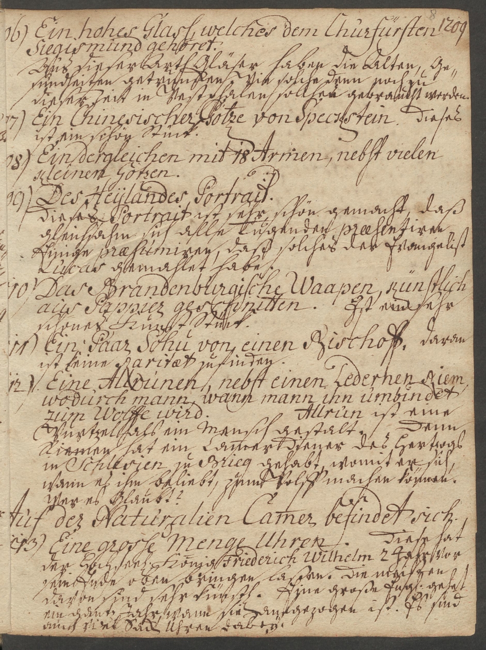 113. Eine große Menge Uhren. [Ergänzung:] Diese hat/ der Hochseel. König Friederich Wilhelm 2 Jahr vor/ sein Tode oben bringen laßen. Die meisten/ davon sind sehr künstl. Eine große Engl. gehet/ ein gantz Jahr, wenn sie aufgezogen ist. Es sind/ auch viel Sack Uhren dabey.