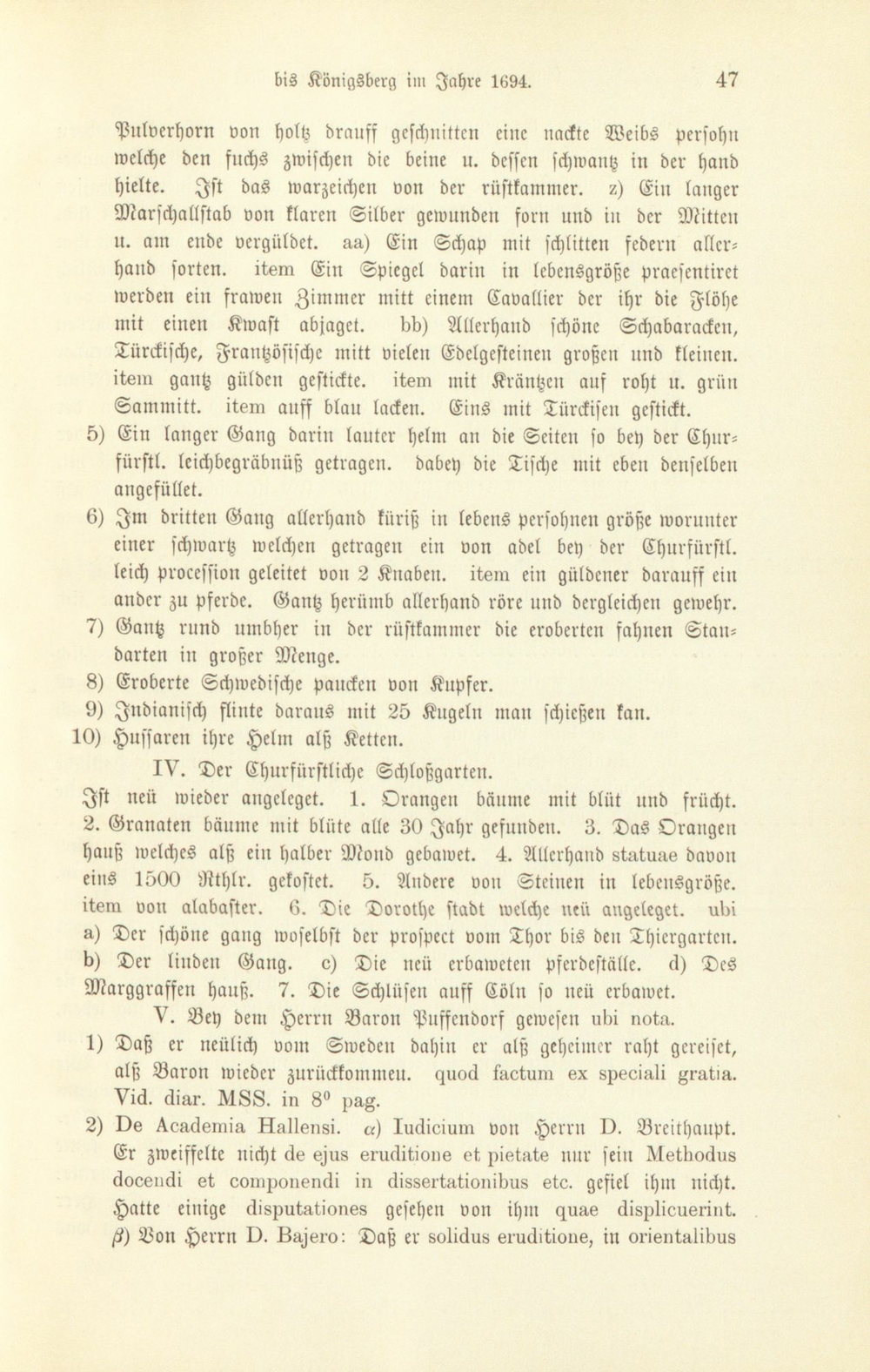 Pulverhorn von holtz darauff geschnitten eine nackte Weibs persohn/ welche den fuchs zwischen die beine u. dessen schwantz in der hand/ hielte. Ist das warzeichen von der rüstkammer. z) Ein langer/ Marschallstab von klaren Silber gewunden forn und in der Mitten/ u. am ende vergüldfet. aa) Ein Schap mit schlitten federn aller=/hand sorten. item Ein Spiegel darin in lebensgröße praesentiret/ werden ein frawen Zimmer mitt einem Cavallier der ihr die Flöhe/ mit einem Kwast abjaget. bb) Allerhand schöne Schabracken,/ Türckische, Frantzösische mitt vielen Edelgesteinen großen und kleinen./ item gantz gülden gestickte. item mit Kräntzen auf roht u. grün/ Sammitt. item auff blau lacken. Eins mit Türckisen gestickt./