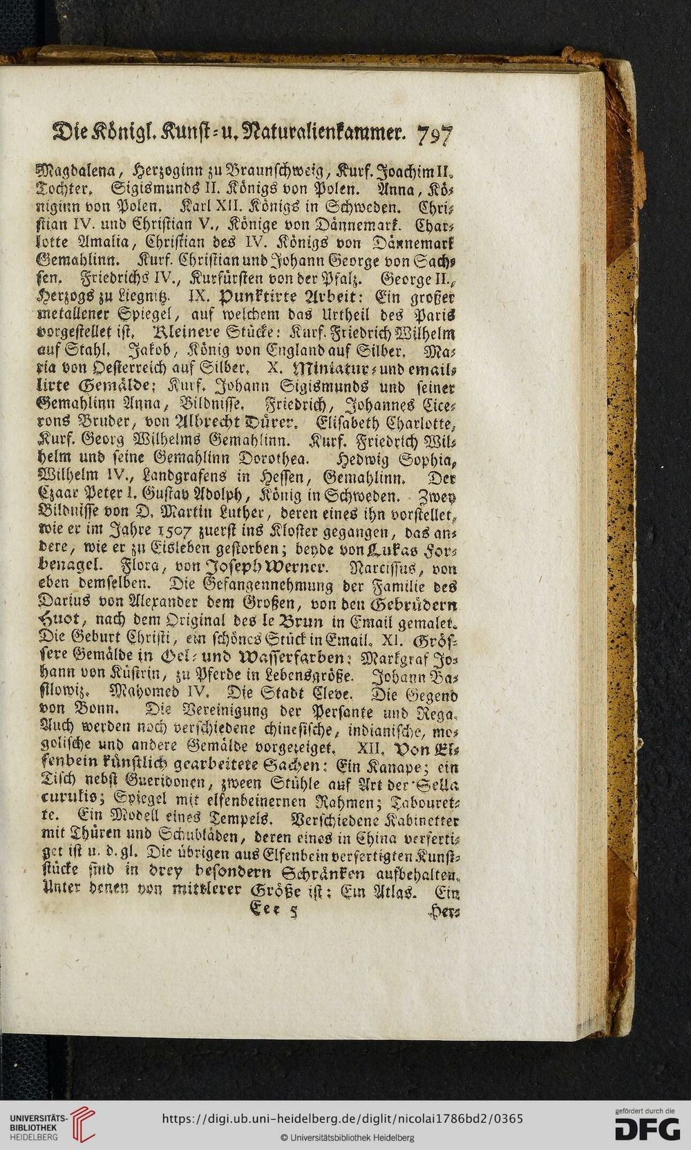 Magdalena, Herzoginn zu Braunschweig, Kurf. Joachim II./ Tochter. Sigismunds II. Königs von Polen. Anna, Kö-/niginn von Polen. Karl XII. Königs in Schweden. Chri-/stian IV. und Christian V., Könige von Dännemark. Char-/lotte Amalia, Christian des IV. Königs von Dännemark/ Gemahlinn. Kurf. Christian und Johann George von Sach-/sen. Friedrichs IV., Kurfürsten von der Pfalz. George II.,/ Herzogs zu Liegnitz. IX. Punktirte Arbeit: Ein großer/ metallener Spiegel, auf welchem das Urtheil des Paris/ vorgestellet ist. Kleinere Stücke: Kurf. Friedrich Wilhelm/ auf Stahl. Jakob, König von England auf Silber. Ma-/ria von Oesterreich auf Silber. X. Miniatur und email-/lirte Gemälde: Kurf. Johann Sigismunds und seiner/ Gemahlinn Anna, Bildnisse. Friedrich, Johannes Cice-/rons Bruder, von Albrecht Dürer. Elisabeth Charlotte,/ Kurf. Friedrich Wilhelms Gemahlin. Kurf. Friedrich Wil-/helm und seine Gemahlin Dorothea. Hedwig Sophia,/ Wilhelm IV., Landgrafens in Hessen, Gemahlinn. Der/ Czaar Peter I. Gustav Adoplh, König in Schweden. Zwey/ Bildnisse von D. Martin Luther, deren eines ihn vorstellet,/ wie er im Jahre 1507 zuerst ins Kloster gegangen, das an-/dere, wie er zu Eisleben gestorben; beyde von Lukas For-/benagel. Flora, von Joseph/ Werner. Narcissus, von eben demselben. Die Gefan-/gennehmung der Familie des Darius von Alexander dem/ Großen, ist von den Gebrüdern Huot, nach dem Original des le Brun in Email gemalet./ Die Geburt Christi, ein schönes Stück in Email. XI. Grös-/sere gemälde in Oel=und Wasserfarben: Jo-/hann von Küstrin, zu Pferde in Lebensgröße. Johann Ba-/silowiz. Mohammed IV. Die Stadt Cleve. Die Gegend/ von Bonn. Die Vereinigung der Persante und Rega./ Auch werden noch verschiedene chinesische, indianische, mo-/golische und andere Gemälde vorgezeiget. XII. Von El-/fenbein künstlich gearbeitete Sachen: Ein Kanape; ein/ Tisch nebst Gueridonen, zween Stühle auf Art der Sella/ [unleserlich]urulis; Spiegel mit elfenbeinernen Rahmen; Tabouret-/te. Ein Modell eines Tempels. Verschiedene Kabinetter/ mit Thüren und Schubläden, deren eines in China verferti-/get ist u. d. gl. Die übrigen aus Elfenbein verfertigten Kunst-/stücke sind in drey besonderen Schränken aufbehalten. Unter denen von mittlerer Größe ist: Ein Atlas. Ein