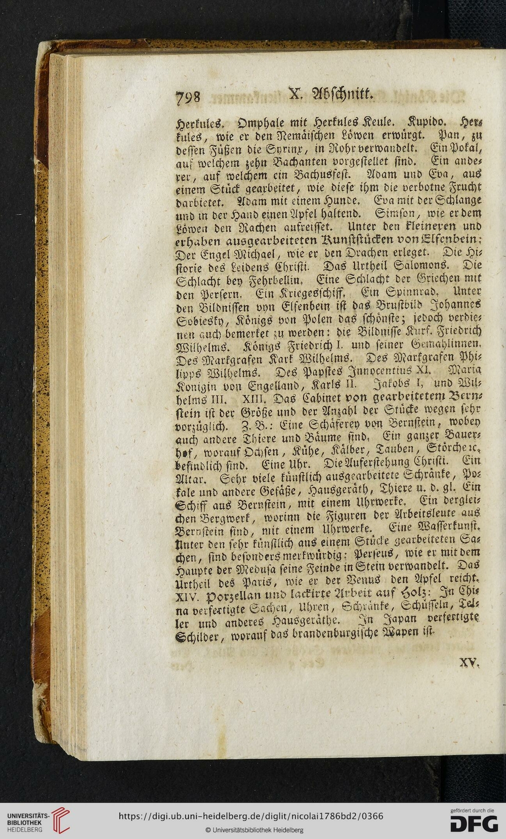 Herkules. Omphale mit Herkules Keule. Kupido. Her-/kules, wie der den Nemäischen Löwen erwürgt. Pan, zu/ dessen Füßen die Syrinx, in Rohr verwandelt. Ein Pokal/ auf welchem zehn Bachanten vorgestellet sind. Ein ande-/rer, auf welchem ein Bachusfest. Adam und Eva, aus/ einem Stück gearbeitet, wie diese ihm die verbotne Frucht/ darbietet. Adam mit einem Hunde. Eva mit einer Schlange/ und in der Hand einen Apfel haltend. Simson, wie er dem/ Löwen den Rachen aufreisset. Unter den kleineren und/ erhaben ausgearbeiteten Kunststücken von Elfenbein:/ Der Engel Michael, wie er den Drachen erleget. Die hi-/storie des Leidens Christi. das Urtheil Salomons. Die/ Schlacht bey Fehrbellin. Eine Schlacht der Griechen mit/ den Persern. Ein Kriegsschiff. Ein Spinnrad. Unter/ den Bildnissen von Elfenbein ist das Brustbild Johannes/ Sobiesky, Königs von Polen das schönste; jedoch verdie-/nen auch bemerket zu werden: die Bildnisse Kurf. Friedrich/ Wilhelms. Königs Friedrich I. und seiner Gemahlinnen./ Des Merkgrafen Karl Wilhelms. Des Markgrafen Phi-/lipps Wilhelms. Des Papstes Innocentius XI. Maria/ Königin von Engelland, Karls II. Jakobs I, und Wil-/helms III. XIII. Das Cabinet von gearbeitetem Bern-/stein ist der Größe und der Anzahl der Stücke wegen sehr/ vorzüglich. Z.B: Eine Schäferei von Bernstein, wobey/ auch andere Thiere und Bäume sind. Ein ganzer Bauern-/hof, worauf Ochsen, Kühe, Kälber, Tauben, Störche ⁊c/ befindlich sind. Eine Uhr. Die Auferstehung Christi. Ein/ Altar. Sehr viele künstlich ausgearbeitete Schränke, Po-/kale und andere Gefäße, Hausgeräth, Thiere u. d. gl. Ein/ Schiff aus Bernstein, mit einem Uhrwerke. Ein derglei-/chen Bergwerk, worinn die Figuren der Arbeitsleute aus/ Bernstein sind, mit einem Uhrwerke. Eine Wasserkunst./ Unter den sehr künstlich aus einem Stücke gearbeiteten Sa-/chen, sind besonders merkwürdig: Perseus, wie er mit dem/ Haupte der Medusa seine Feinde in Stein verwandelt. Das/ Urtheil des Paris, wie er der Venus den Apfel reicht./ XIV. Porzellan und lackirte Arbeit auf Holz: In Chi-/na verfertigte Sachen, Uhren, Schränke, Schüsseln, Tel-/ler und anderes Hausgeräthe. In Japan verfertigte/ Schilder, worauf das brandenburgische Wapen ist.