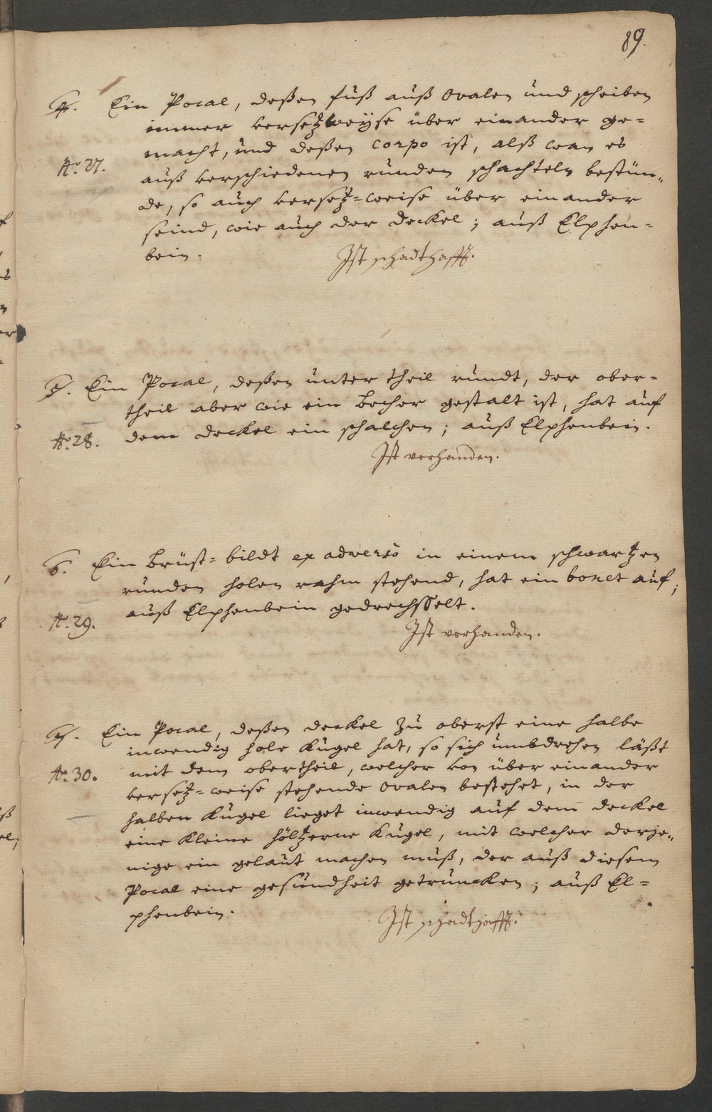 7.No. 30. Ein Pocal, deßen Deckel zu oberst eine halbe/ inwendig hole Kugel hat, so sich umbdrehen läßt/ mit dem obertheil, welcher von über einander/ versetz-weise stehende ovalen bestehet, in der/ halben Kugel lieget inwendig auf dem deckel/ eine kleine höltzerne Kugel, mit welcher derje=/nige ein gelaut machen muß, der auß diesem/ Pocal eine gesundheit getruncken; auß El=/phenbein/ Ist schadthafft.